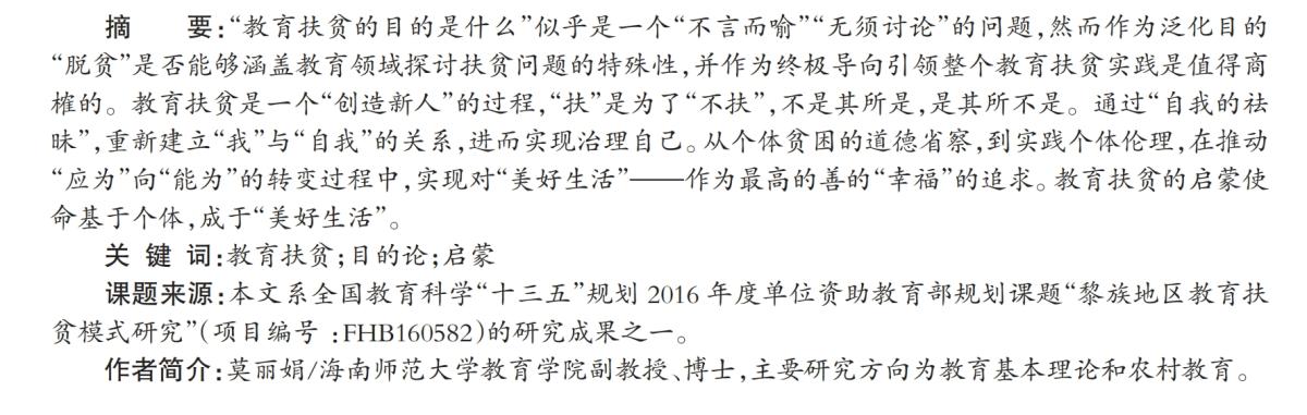 课题来源:本文系全国教育科学“十三五”规划 2016 年度单位资助教育部规划课题“黎族地区教育扶贫模式研究”(项目编号 :FHB160582)的研究成果之一。作者简介:莫丽娟/海南师范大学教育学院副教授、博士,主要研究方向为教育基本理论和农村教育