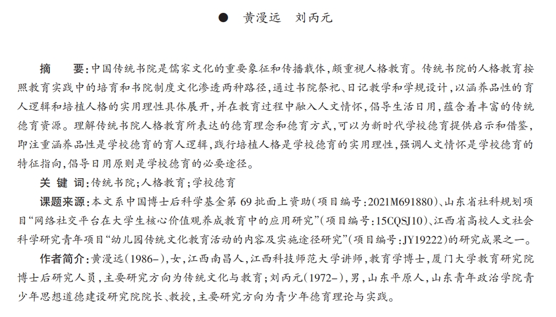 摘要:中国传统书院是儒家文化的重要象征和传播载体,颇重视人格教育。传统书院的人格教育控照教育实践中的培育和书院制度文化渗透两种路径,通过书院祭祀、日记教学和学规设计,以涵养品性的育人逻辑和培植人格的实用理性具体展开,并在教育过程中融入人文情怀,倡导生活日用,蕴含着丰富的传统德育资源。理解传统书院人格教育所表达的德育理念和德育方式,可以为新时代学校德育提供启示和借鉴即注重涵养品性是学校德育的育人逻辑。践行培植人格是学校德育的实用理性,强调人文情怀是学校德育的特征指向,倡导日用原则是学校德育的必要途径。