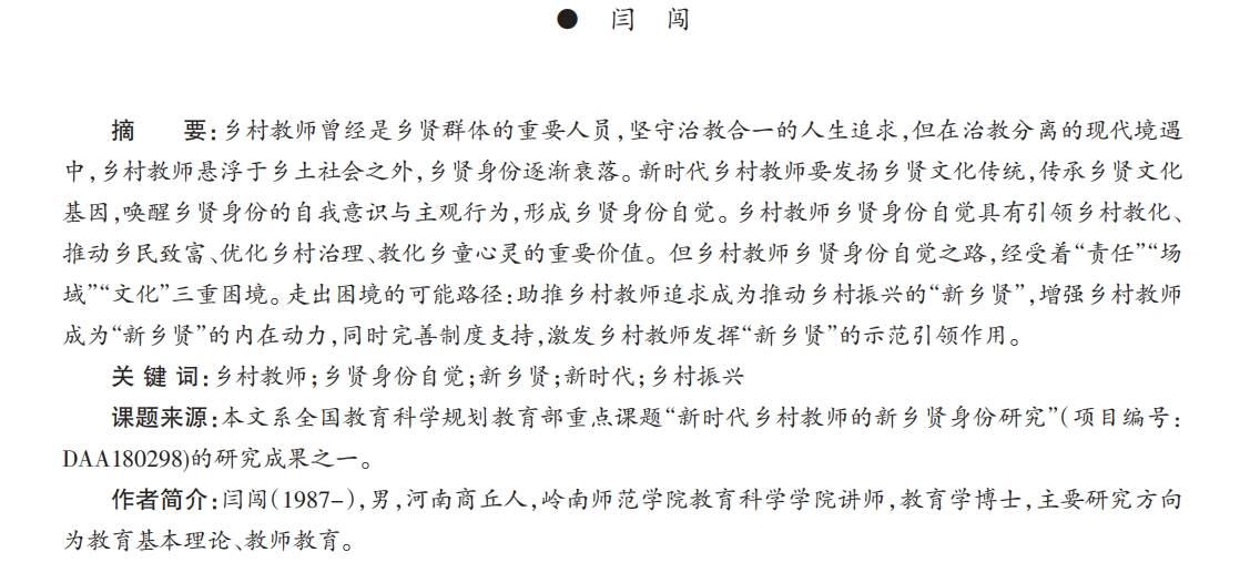摘要:乡村教师曾经是乡贤群体的重要人员,坚守治教合一的人生追求,但在治教分离的现代境遇中,乡村教师悬浮于乡土社会之外,乡贤身份逐渐衰落。新时代乡村教师要发扬乡贤文化传统,传承乡贤文化基因,唤醒乡贤身份的自我意识与主观行为,形成乡贤身份自觉。乡村教师乡贤身份自觉具有引领乡村教化、推动乡民致富、优化乡村治理、教化乡童心灵的重要价值。但乡村教师乡贤身份自觉之路,经受着“责任”“场域”“文化”三重困境。走出困境的可能路径:助推乡村教师追求成为推动乡村振兴的“新乡贤”。增强乡村教师成为“新乡贤”的内在动力,同时完善制度支持,激发乡村教师发挥“新乡贤”的示范引领作用。