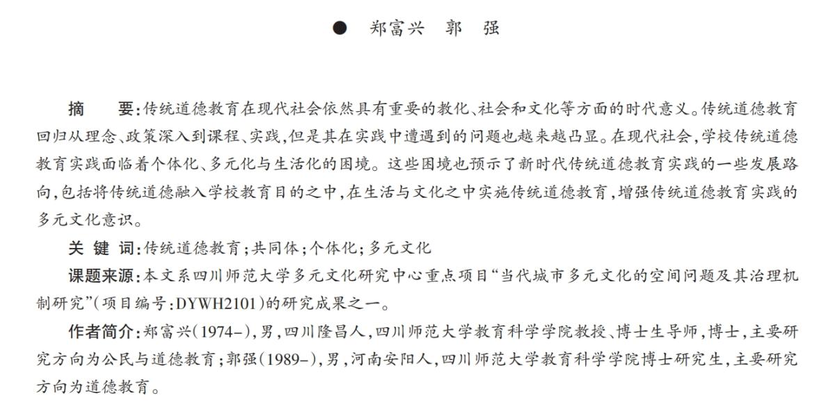 摘要:传统道德教育在现代社会依然具有重要的教化、社会和文化等方面的时代意义。传统道德教育回归从理念、政策深入到课程、实践,但是其在实践中遭遇到的问题也越来越凸显。在现代社会,学校传统道德教育实践面临着个体化、多元化与生活化的困境。这些困境也预示了新时代传统道德教育实践的一些发展路向,包括将传统道德融入学校教育目的之中,在生活与文化之中实施传统道德教育,增强传统道德教育实践的多元文化意识。